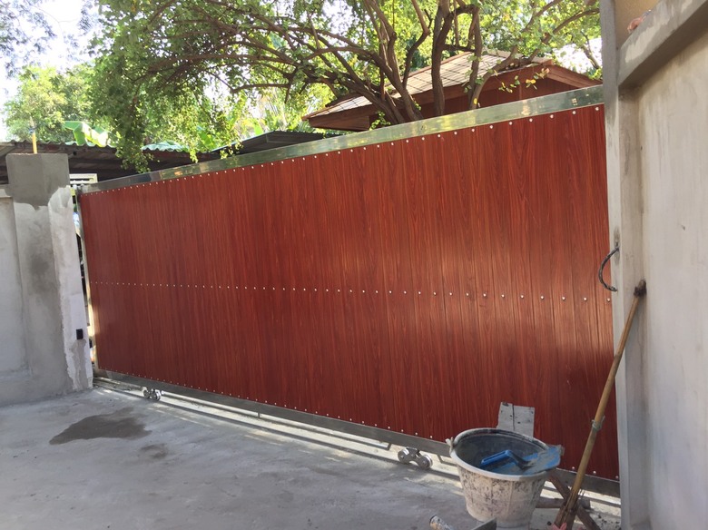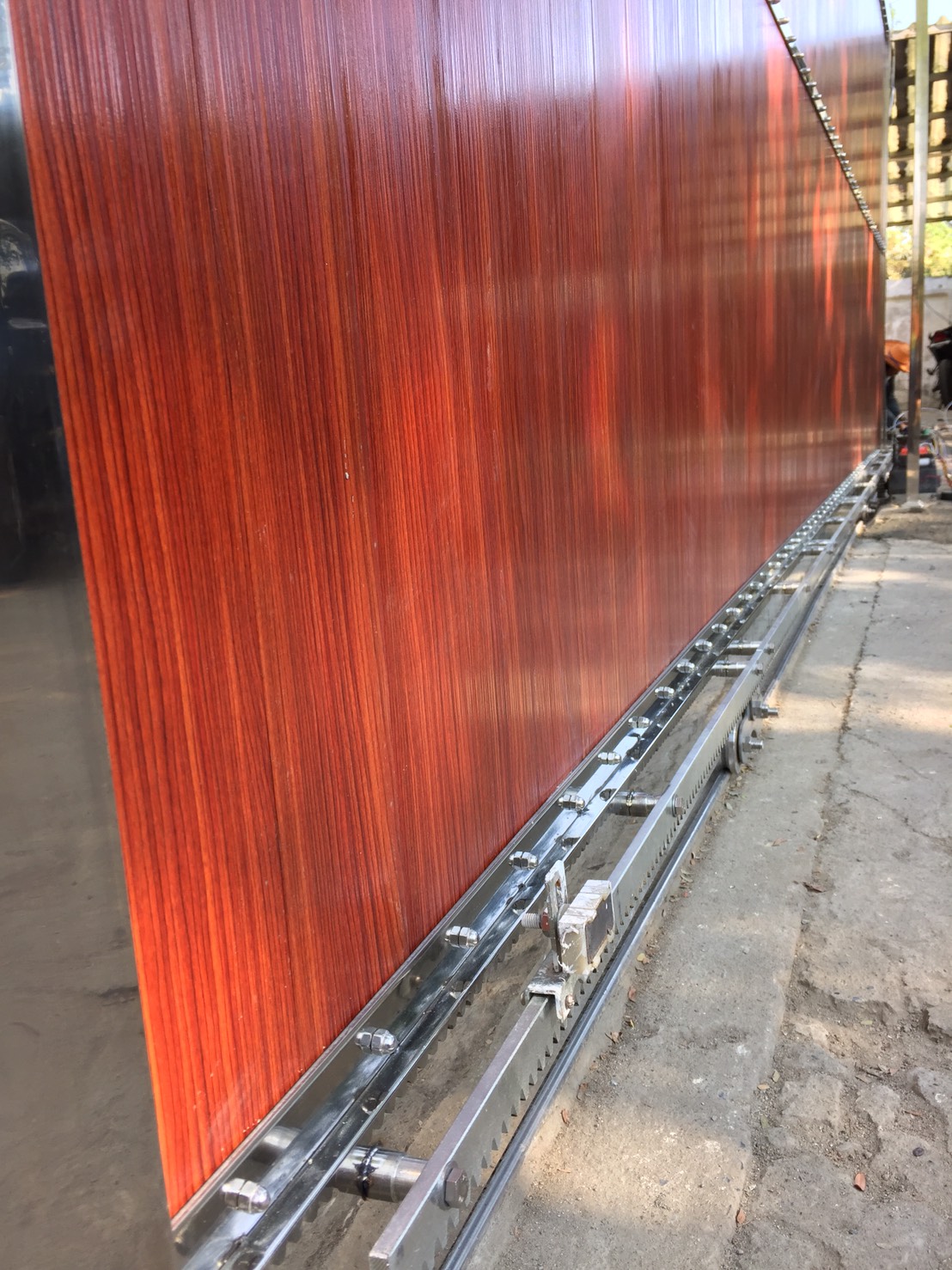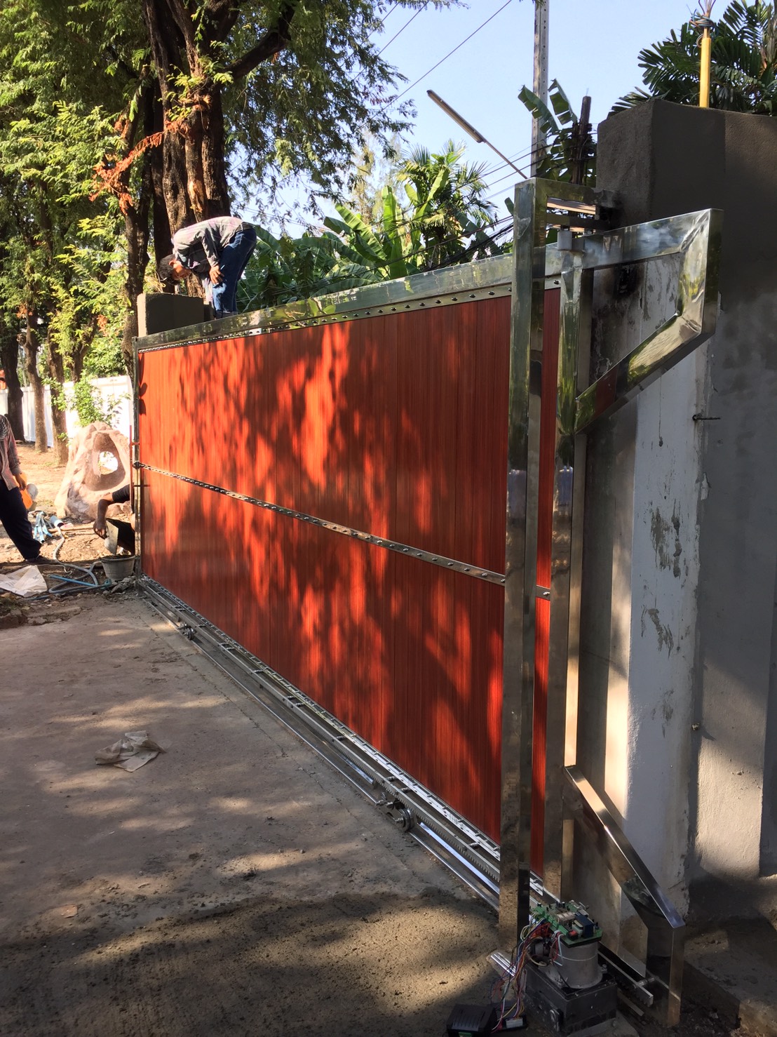 งานติดตั้งชุดประตูบานเลื่อนตรงที่ขนาดความกว้าง 5.50 สูง 1.80 เมตร วัสดุสเเตนเลสเกรด 304 ผสมด้วยอลูมิเนียมงายไม้ทั้งหมดเน้นลายทึบทั้งบาน วางรางด้วยสเเตนเลสทั้งหมด ขับเคลือนด้วยมอเตอร์ประตูรีโมท ขนาด 800 kg