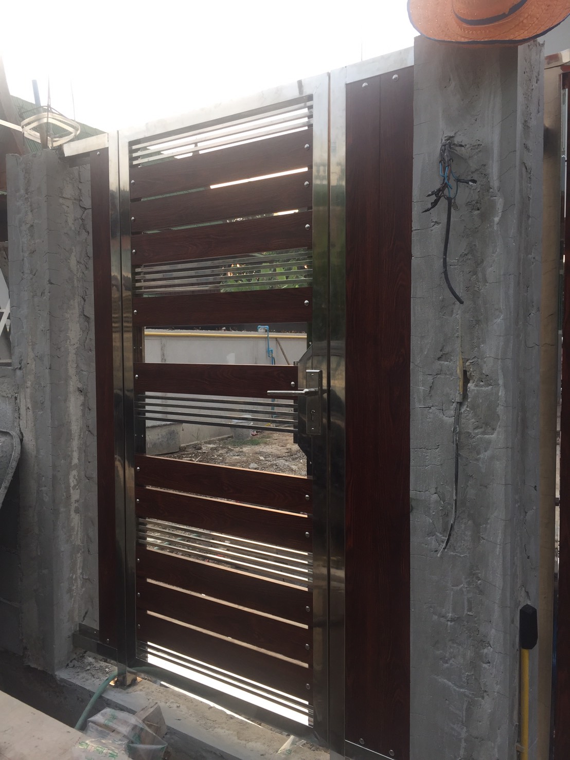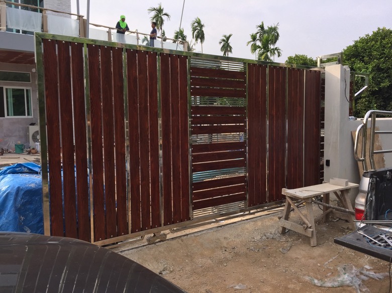 งานประตูรั้วสเเตนเลสผสมอลูมิเนียมลายไม้สักทอง วางลายเเนวสลับตามชอบ ขนาดกว้าง 5.30 สูง 1.90 เมตร ขับเคลื่อนด้วยชุมอเตอร์ประตูรีโมทระบบคอยเเช่น้ำมัน ขนาดรับน้ำหนัก 1500 kg
